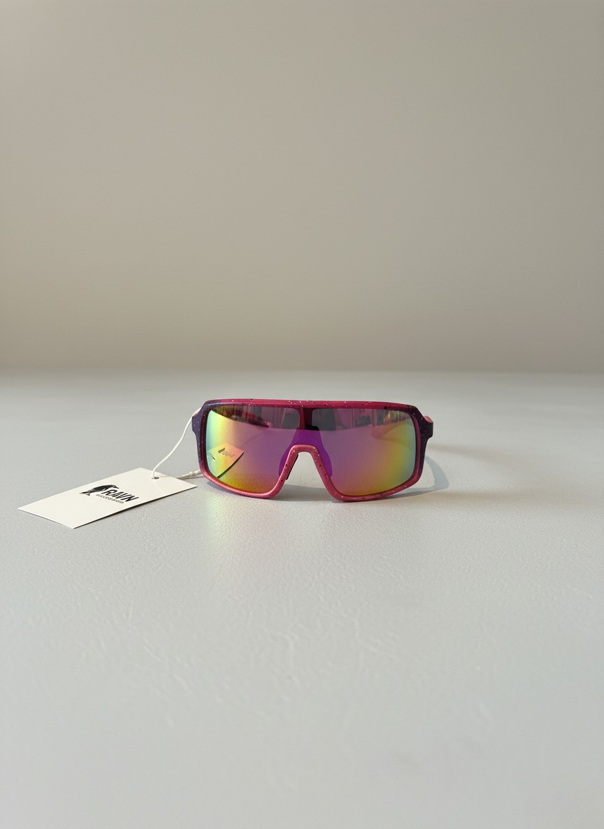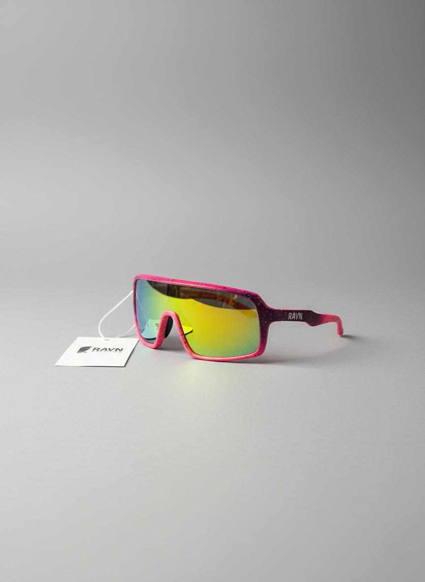 Roze/paars frame met roze/gele lens. Bold. Fel. Anders.
