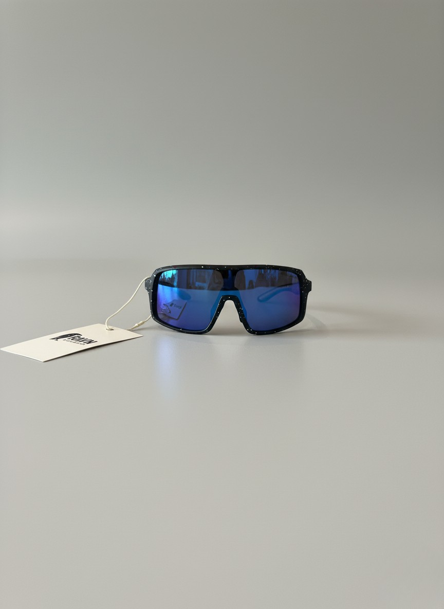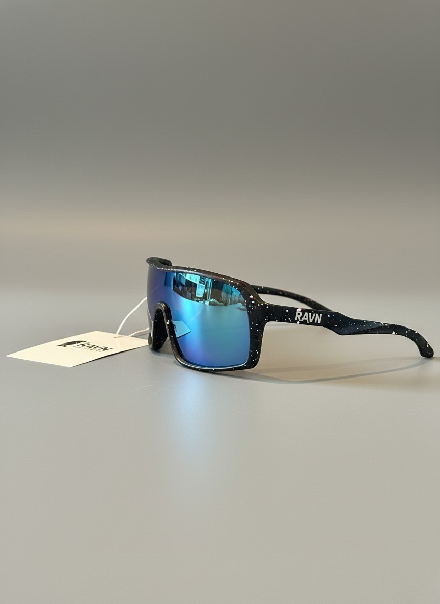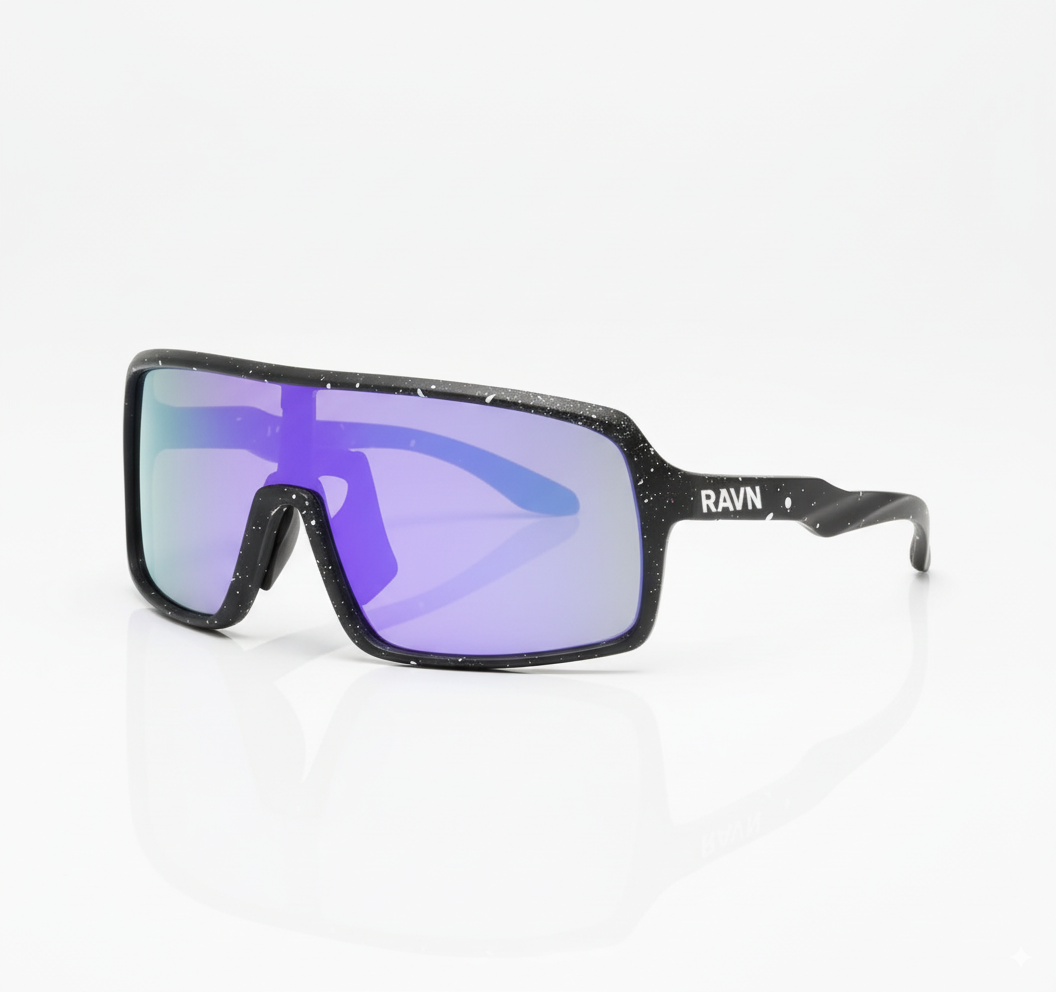 Zwart met witte spikkels en paarse lens. Net als jij: uniek.